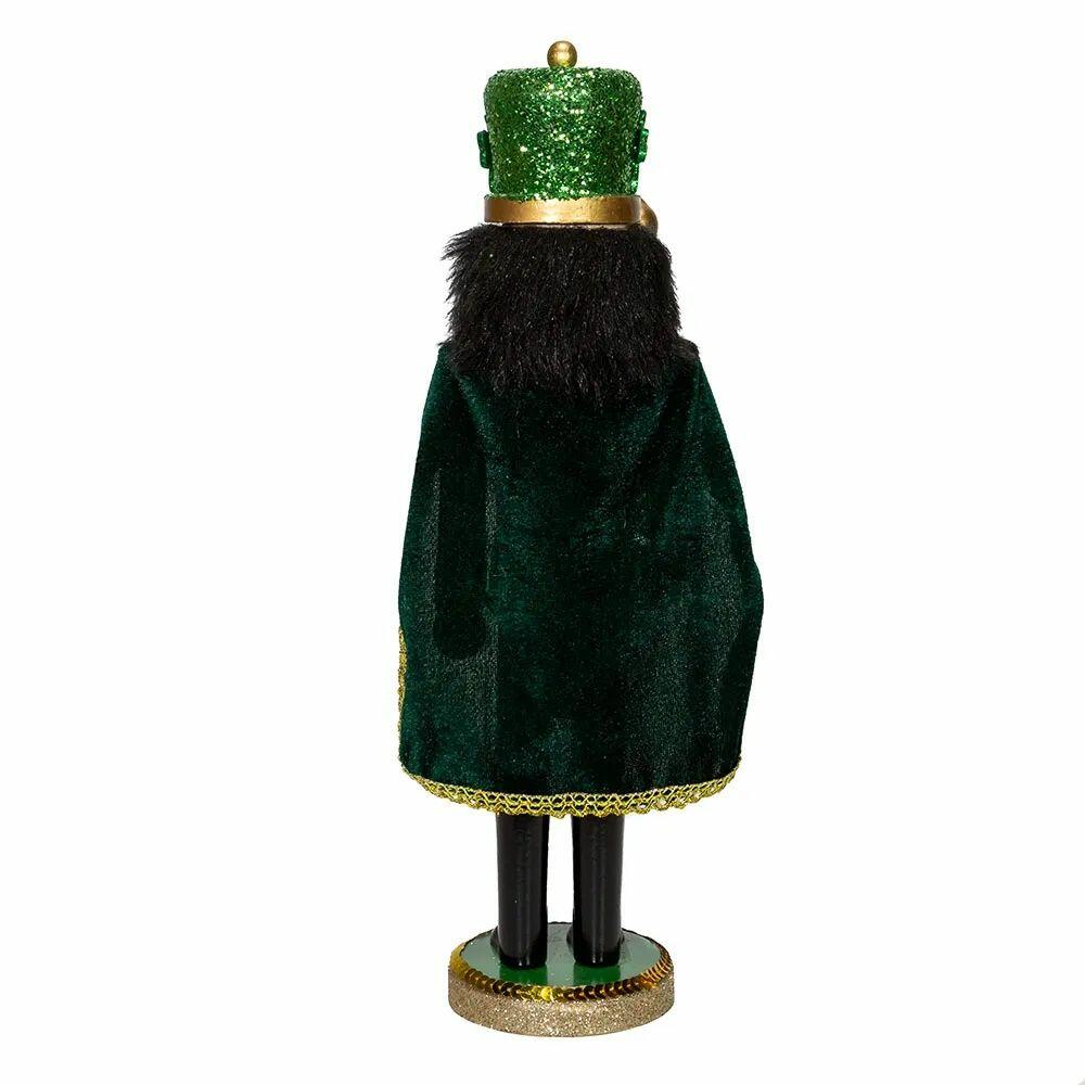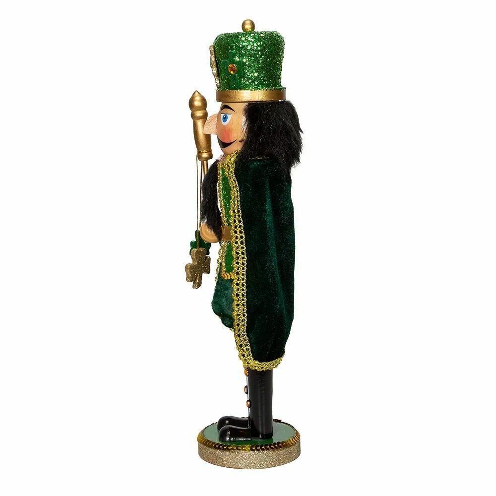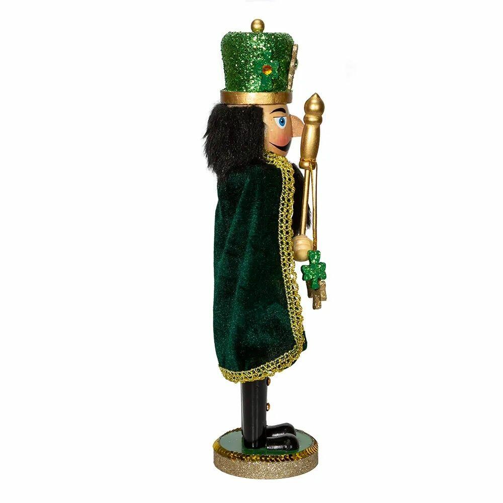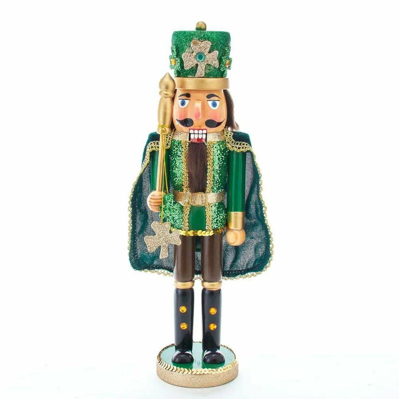 This Kurt Adler wooden Irish nutcracker with cape is a fun, festive way to add to your holiday décor or nutcracker collection. This glittering nutcracker shines in green, wears a tall green glittered hat with glittered shamrocks and holds a gold staff with a gold glittered shamrock dangle. This piece is perfect for celebrating your Irish heritage or for St. Patrick's day!