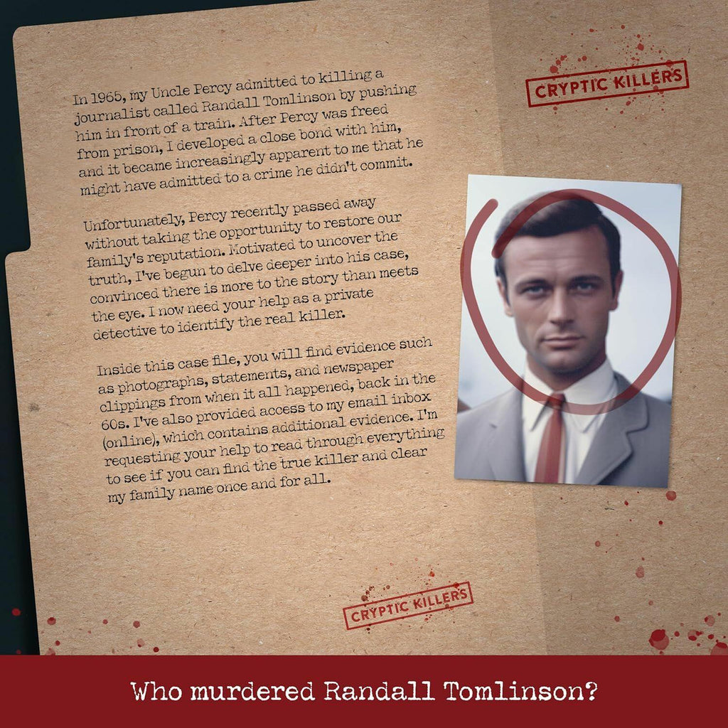 In 1965, my Uncle Percy admitted to the murder of a journalist called Randall Tomlinson by pushing him in front of a train. After Percy was freed from prison, I developed a close bond with him, and it became increasingly apparent to me that he might have admitted to a crime he didn't commit. Unfortunately, Percy recently passed away without taking the opportunity to restore our familys reputation. Motivated to uncover the truth, I've begun to delve deeper into his case, convinced there is more to the story than meets the eye. I now need your help as a private detective to identify the real killer. Eliminate as many of the suspects as possible, so that we can find the killer (or killers) and bring them to justice.
