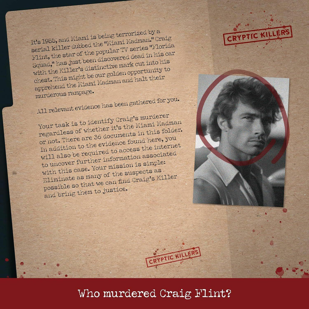 It's 1985, and Miami is being terrorized by a serial killer dubbed the "Miami Madman." Craig Flint, the star of the popular TV series "Florida Squad," has just been discovered dead in his car with the Killer's distinctive mark cut into his chest. This might be our golden opportunity to apprehend the Miami Madman and halt their murderous rampage. All relevant evidence has been gathered for you. Your task is to identify Craig's murderer regardless of whether it's the Miami Madman or not. Your mission is simple: Eliminate as many of the suspects as possible, so that we can find the killer (or killers) and bring them to justice.
