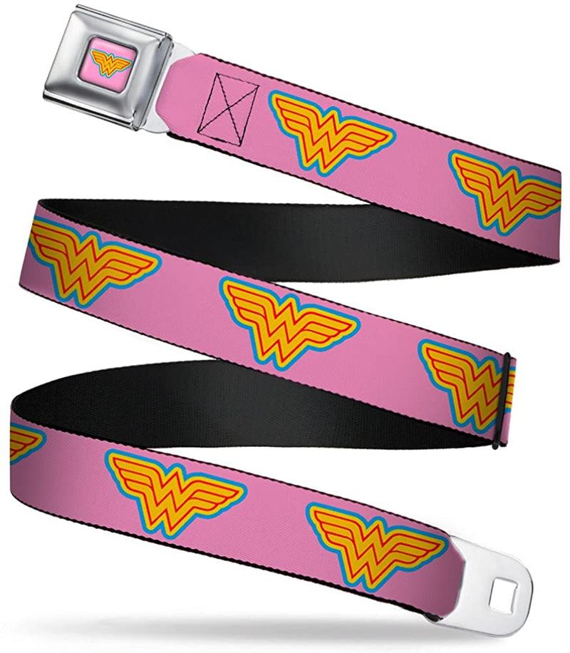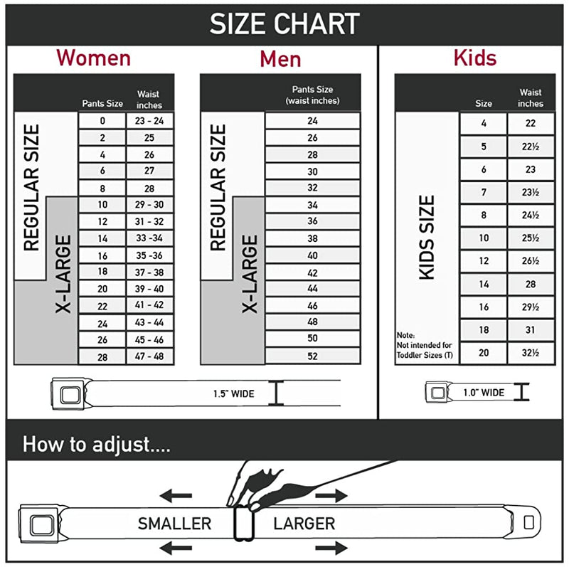 Seatbelt belts are made with an authentic metal seat belt buckle. The belt is "one size fits most" that adjusts easily to fit a size 24 to 38 inch waist. The belt is 1.5 inches wide and fits most pants loops. Officially Licensed Big Bang Theory artwork brought to you by Buckle-Down. Made in the USA. Not a safety device.