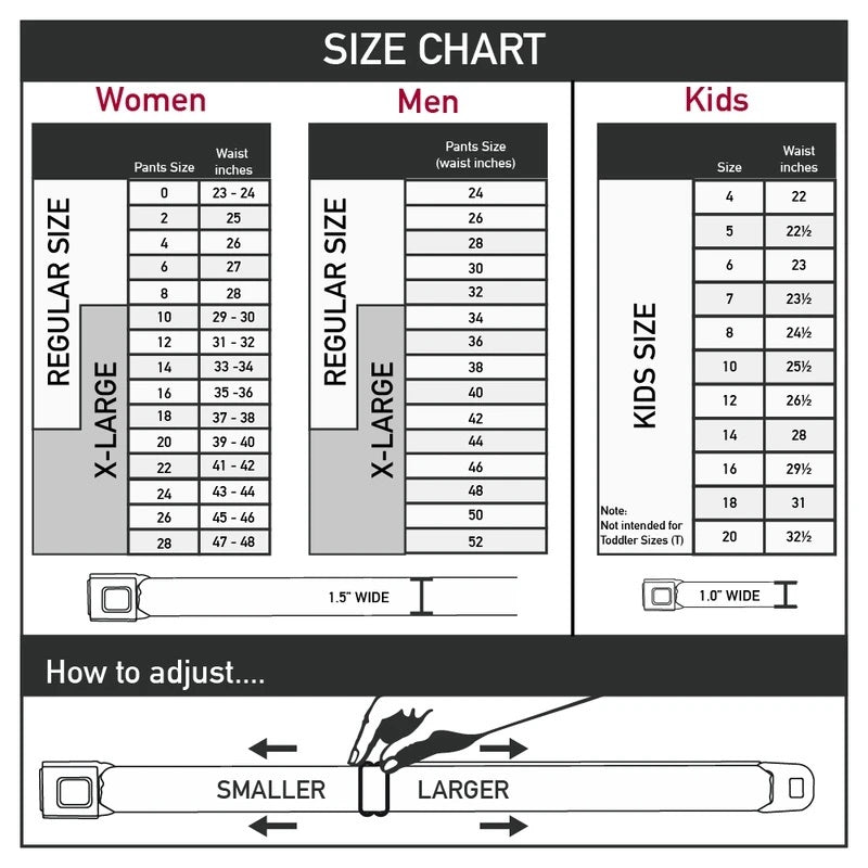 Buckle-Down's iconic Seatbelt Belt is a cool, smart, and exciting blend of fashion and function. Always a conversation starter, our Seatbelt Belt adjusts to perfectly fit your waist while showcasing your unique sense of style. Our Seatbelt Belts are made with authentic automotive style seatbelt buckles making them easy to open and close at the push of a button. Our Regular and XL Seatbelt belts are 1.5 inches wide and our Kid's Seatbelt belts are 1.0 inch wide. This product is Handcrafted in USA by Buckle-Down Inc. and Officially Licensed.