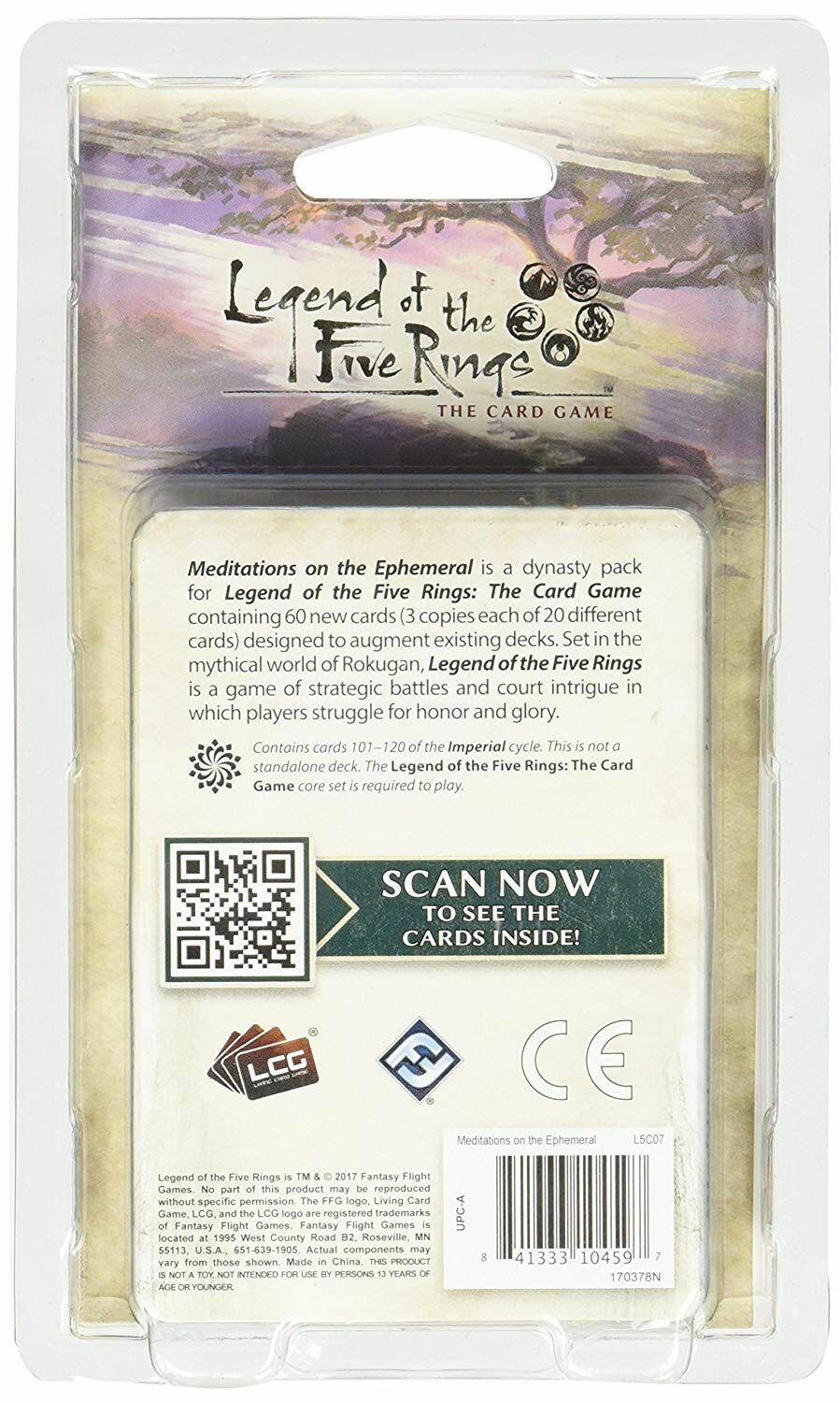 Experience the wonders of the Imperial Cycle with Meditations on the Ephemeral, the sixth Dynasty Pack for Legend of the Five Rings: The Card Game. Each of the seven Great Clans receives new cards that continue to embrace and de ne the themes that began in the Legend of the Five Rings: The Card Game Core Set. Along the way, you'll nd a great assort- ment of cards focused on the Imperial City of Otosan Uchi. From neutral samurai sworn to the Imperial family, to Imperial magistrates from each of the Great Clans, to rewards for holding the Imperial Favor, this cycle draws you into the world of Otosan Uchi and the service of the Emperor.