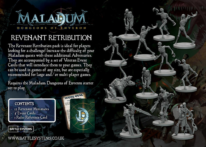 Maladum is a fantasy miniatures board game set in the kingdoms of Enveron, a prosperous continent on a distant world Your players control small bands of Adventurers seeking their fortune across a detailed 3D gaming area (no glue or paint required). You must venture out from your camp, defeat your enemies, complete the objectives and get back to safety -- that last part is vital! When the Adventurers have taken their actions, the game fights back -- evil revenants shamble towards you, wandering beasts emerge from their lairs and fellow NPC Adventurers find themselves lost in the chaos, all controlled by the game's mechanics! The Revenant Retribution pack is ideal for players looking for a challenge!