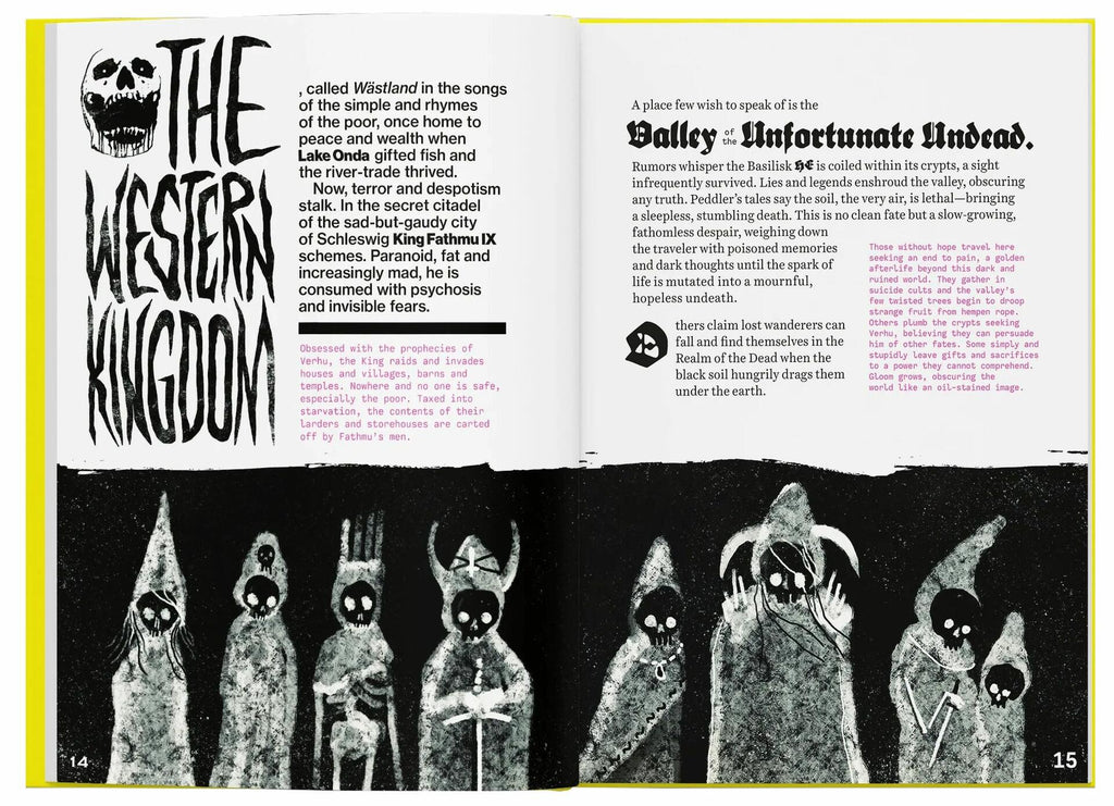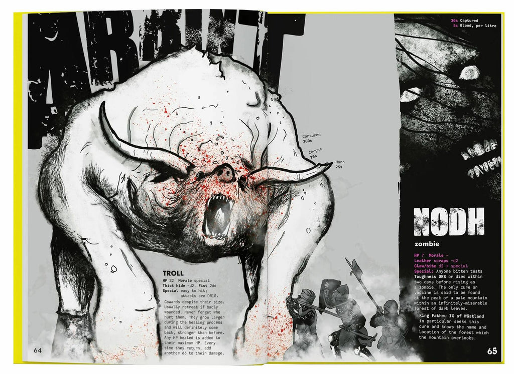 MRK BORG is a pitch-black apocalyptic fantasy RPG about lost souls and fools seeking redemption, forgiveness or the last remaining riches in a bleak and dying world. Who are you? The tomb-robber with silver glittering between cracked fingernails? The mystic who would bend the worlds heart away from its inevitable end? Confront power-draining necromancers, skulking skeletal warriors and backstabbing wickheads. Wander the Valley of the Unfortunate Undead, the catacombs beneath the Bergen Chrypt or the bedevilled Sarkash forest. But leave hope behind - the worlds cruel fate is sealed, and all your vain heroic efforts are destined to end in death and dismay. Or are they?