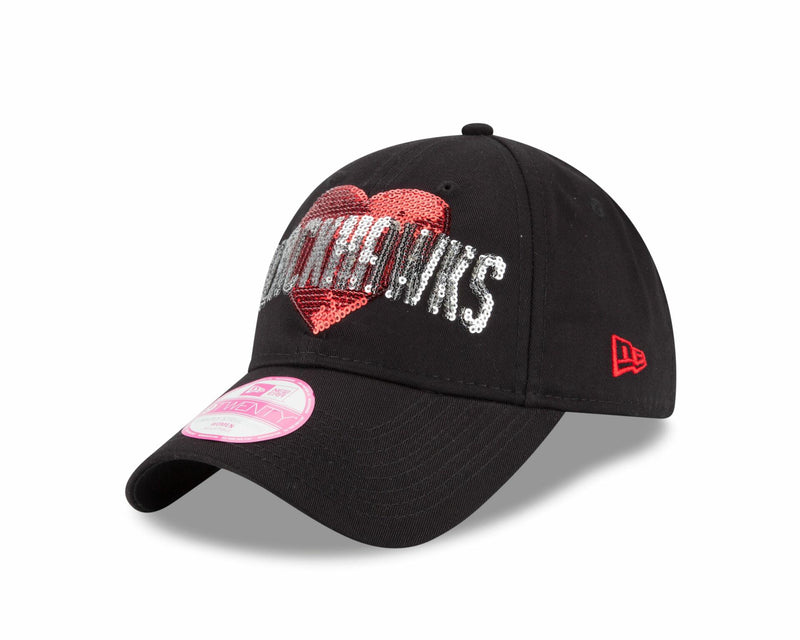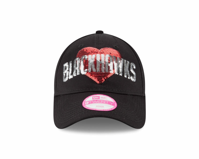 Officially licensed 9TWENTY lightly structured hat by New Era. Adjustable strap back. 100% cotton, imported. Featuring team & heart design made of sequins. Standard hat (women) sizing.