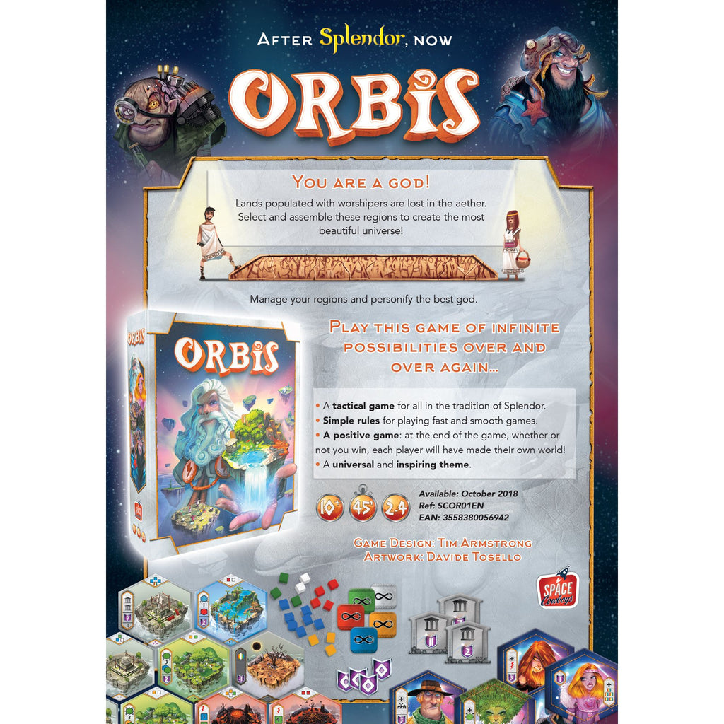 Orbis is a tactical game of World development and strategic resource management, in which players take on the roles of gods creating their best universes. Utilizing lands lost in the aether, players accumulate worshippers to spend on even more fruitful lands—some of which Grant game-changing bonuses. The key to victory lies in having the most creation points at the end of the game! On your turn, you must take a tile from either the nine region tiles in the center of the table or the available God tiles (only one God tile may be taken per player throughout the game). every time you take a region tile, worshippers of the same color as the tile taken are placed on adjacent tiles, making the tiles left behind more enticing for the next player. Restrictions apply to region tile placement, making each decision tougher than the last! In just ten rounds, the game ends when all players have created their universe, at which point creation points are calculated, bonus tiles awarded, and a winner is crowned. Beautifully simple yet rich in strategy, ORBIS is a different game Each and every time you play it. Become the best God and craft your most prosperous universe!