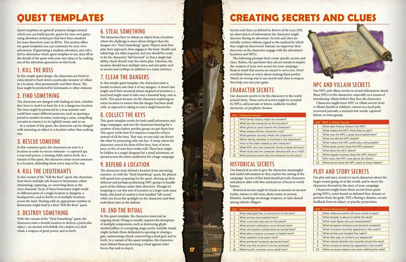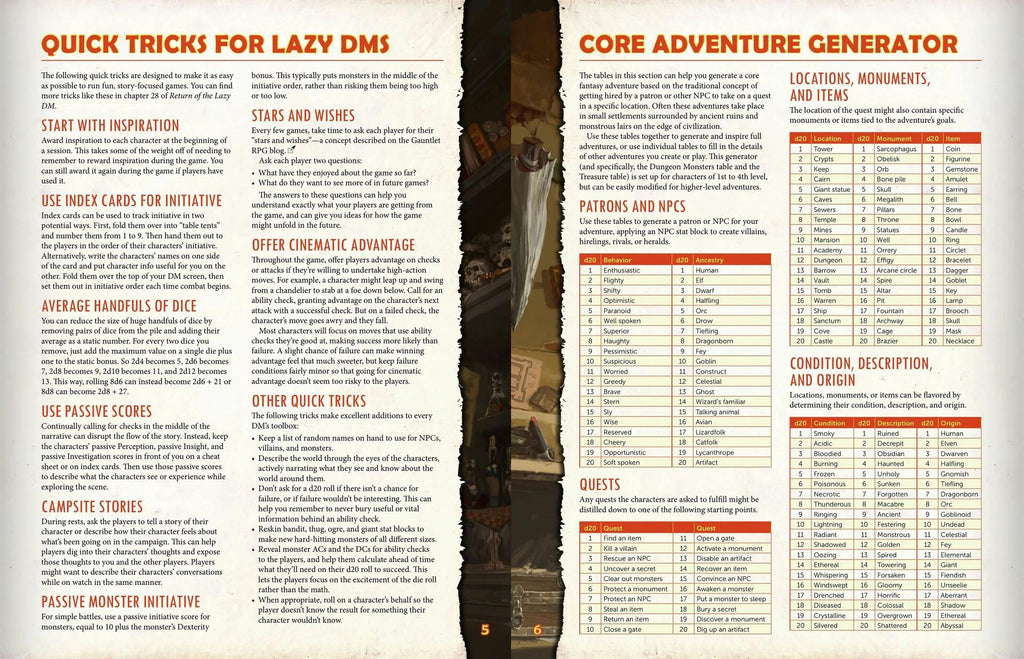 The Lazy DM's Companion is a 64 page book of guidelines and inspirational generators to help you build, prepare, and run awesome D&D games. Sitting alongside Return of the Lazy Dungeon Master and Lazy DM's Workbook, the Lazy DM's Companion streamlines play and fires off your imagination to build awesome and unique worlds for you and your players to explore.
