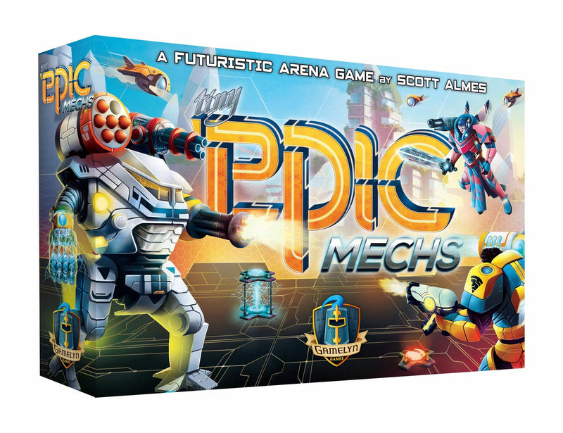 Tiny Epic Mechs is an arena-style player-vs-player action-programming game. It features ITEMeeples with plastic molded power armors and a Mech suit that the ITEMeeples actually go inside of. In Tiny Epic Mechs, players take on the roles of highly skilled and athletic Mech pilots. They compete in a free-for-all battle royale over the span of six rounds. In each round, players select four of eight available actions to program. These actions keep you moving around the arena while allowing you to deploy high-scoring defensive turrets, plant explosive land mines with hidden values, collect resources, purchase weaponry, and power up into your Power Armor or eventually the highly-sought-after Mech Suit. While each player has their own Power Armor, there is only one Mech Suit, reserved for the king of the hill.